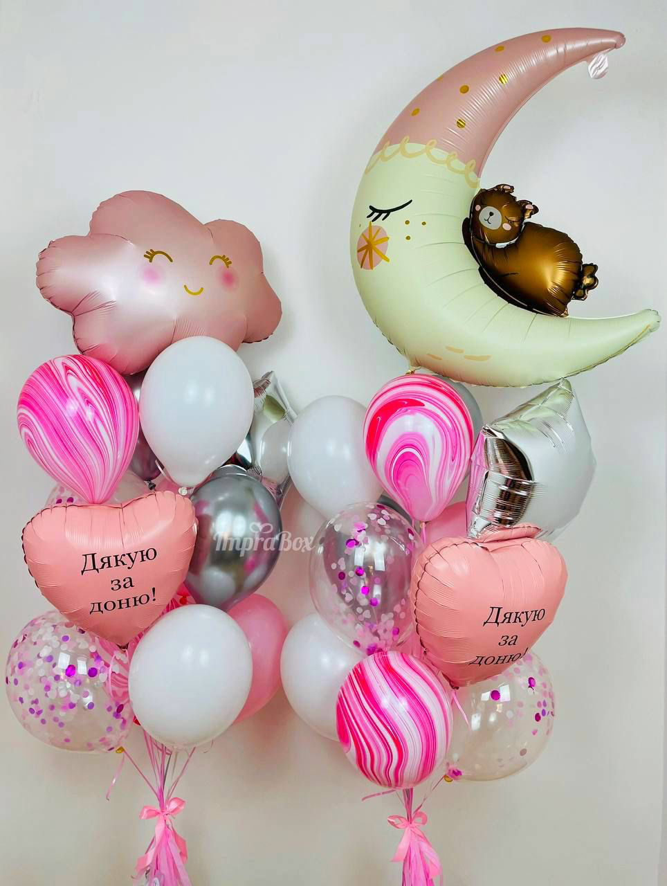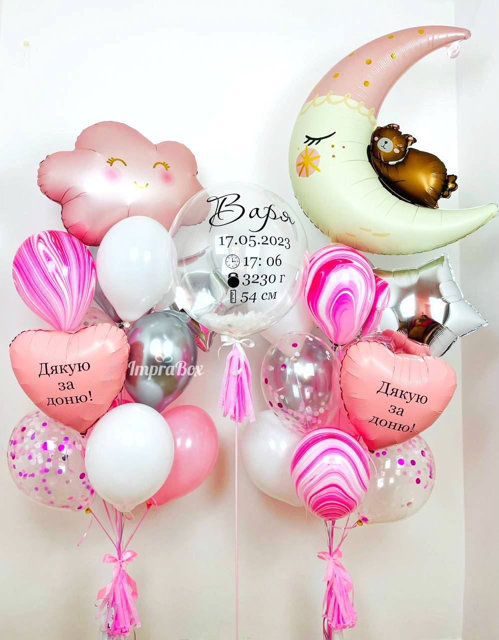 - set nr 2: mix 11 balonów lateksowych + miś na księżycu + serce z napisem personalizowanym