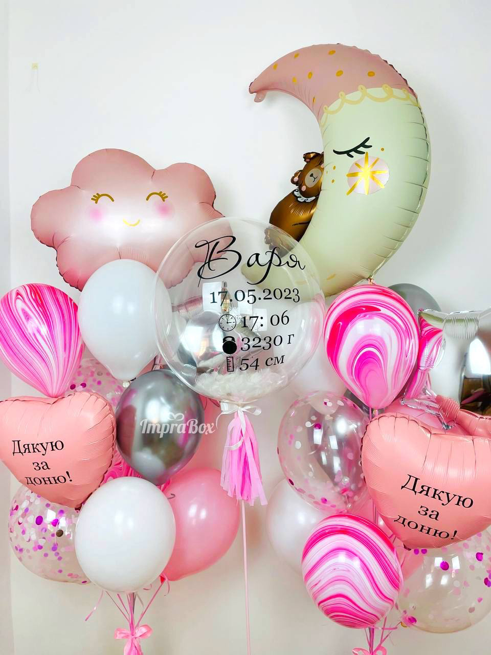 - set nr 3: balon przezroczysty Babbles z małymi balonikami (lub piórkami) w środku z metryczką dziecka