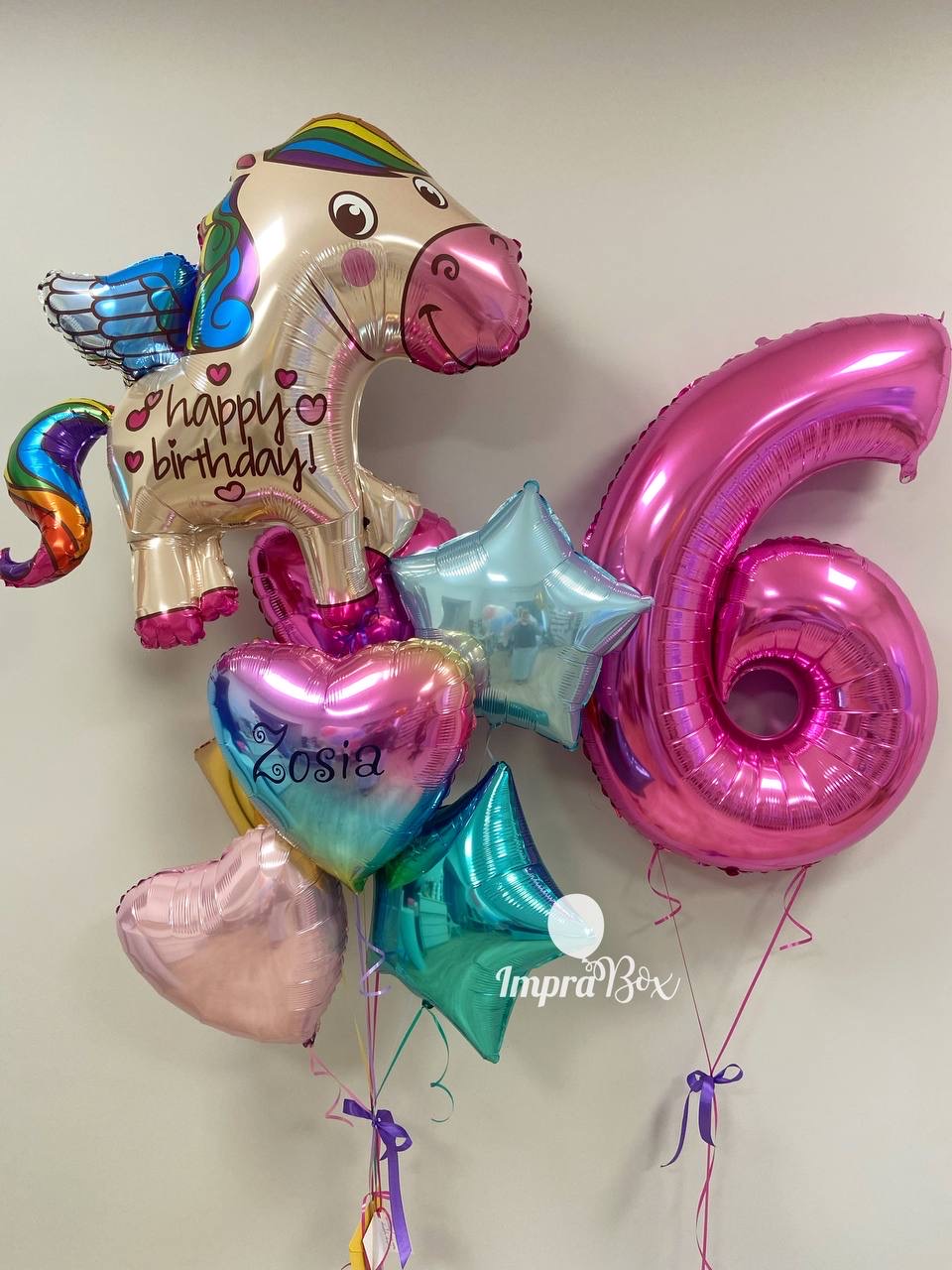 - efektowny zestaw kolorowych gwiazdek i serduszek + figura foliowa jednorożca z napisem Happy Birthday